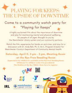 - Rye Free Reading Room, April 11 (3:00-5:00pm)